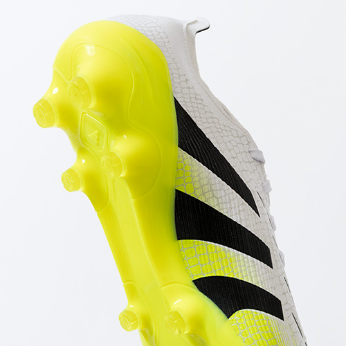 ●様々なグラウンドでの使用を想定して開発された、汎用性の高い楕円形スタッドのマルチグラウンドアウトソール。硬さのあるピッチでの衝撃拡散の向上と最適な回転動作をサポート。