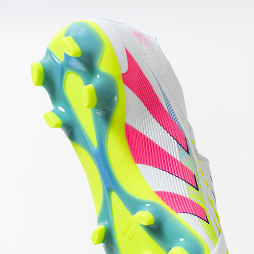 ●様々なグラウンドでの使用を想定して開発された、汎用性の高い楕円形スタッドのマルチグラウンドアウトソール。硬さのあるピッチでの衝撃拡散の向上と最適な回転動作をサポート。