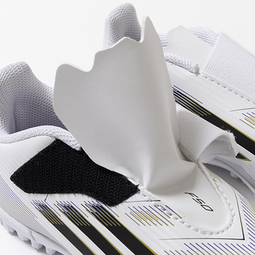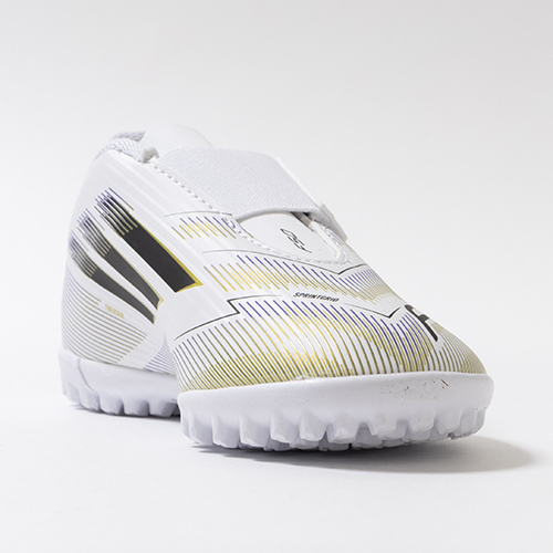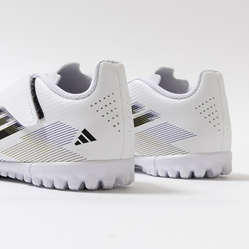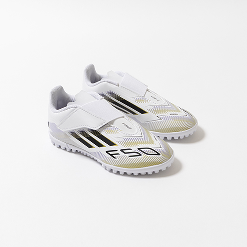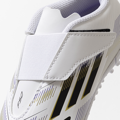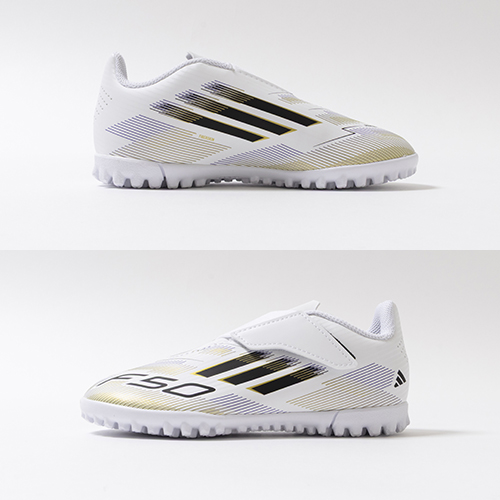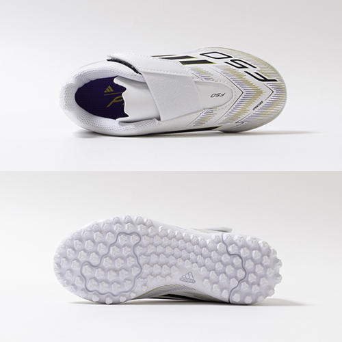 アディダスの象徴的なホワイトとブラックを基調に、シーズンの王者が獲得するトロフィーに敬意を表し、 ゴールドカラーを採用した「ROAD TO GLORY(ロード トゥー グローリー)PACK」が登場。軽量素材とテクノロジーを駆使し、現代のゲームスピードに適応するように再設計されたadidas『F50』のTF(ターフコート)対応ジュニア用トレーニングシューズのワンベルトタイプ。