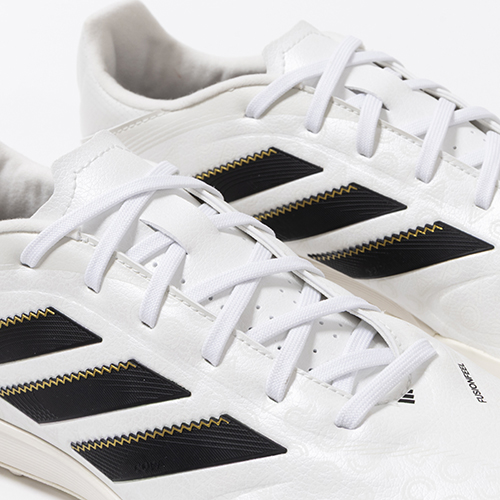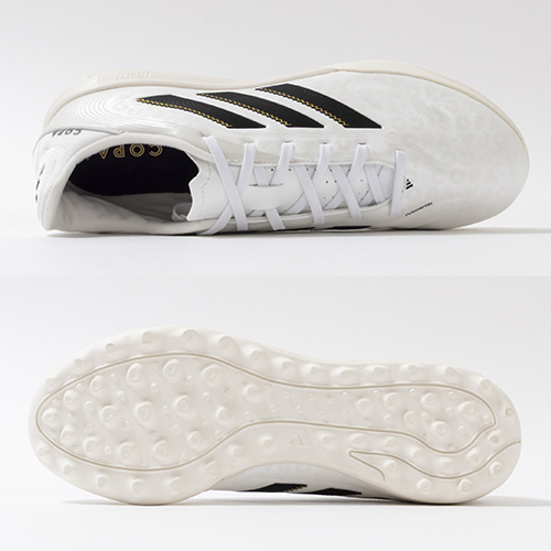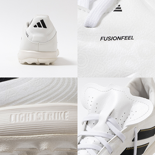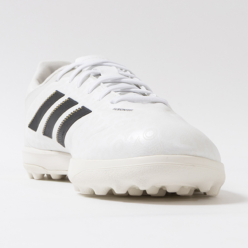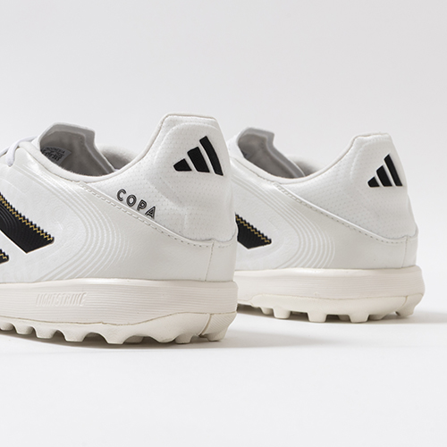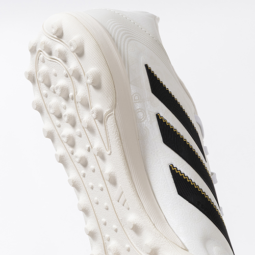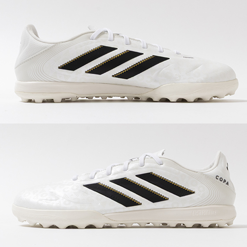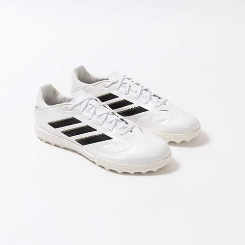 アディダスの象徴的なホワイトとブラックを基調に、シーズンの王者が獲得するトロフィーに敬意を表し、 ゴールドカラーを採用した「ROAD TO GLORY(ロード トゥー グローリー)PACK」が登場。これまで以上に精度の高いコントロールを可能にする。ゲームを自在に操る支配者に捧げる、繊細なボールタッチと比類なき履き心地を追求した設計のadidas「COPA PURE(コパピュア) 3」のLEAGUE(リーグ)モデルTF(ターフコート)対応トレーニングシューズ。