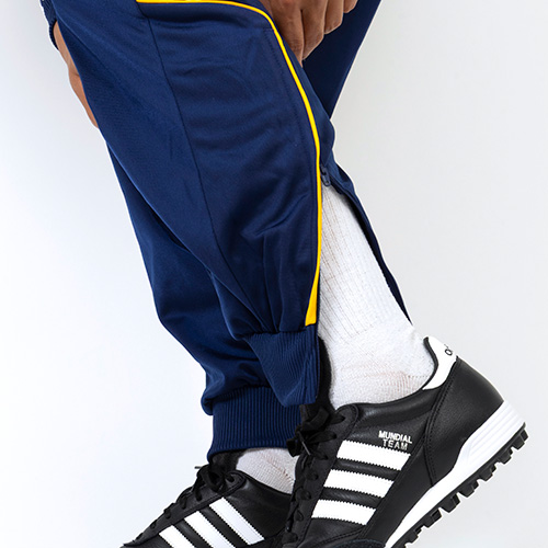 1990年代のサッカーファッションらしいゆったりとしたシルエット。ショーツの上からラクに着用でき、脚に織り込んだ当時のスタイルのクラブエンブレムがアクセントとして際立っている。