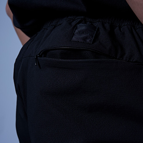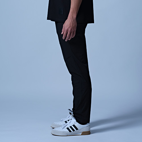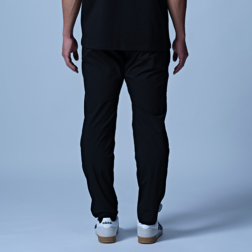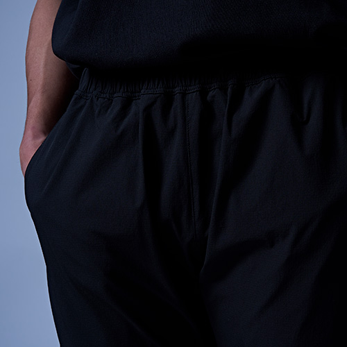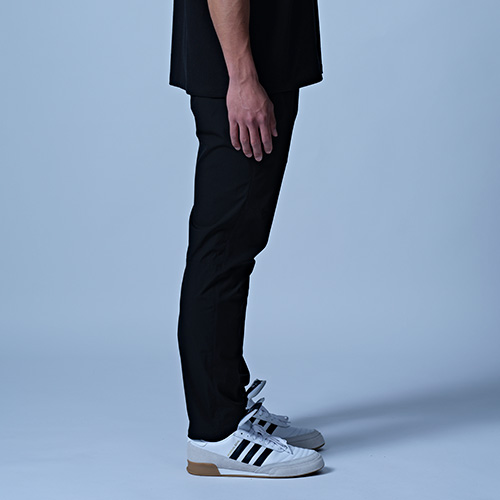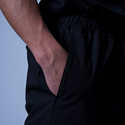 雨や水辺でも活躍する撥水機能付きのパンツ。おススメはセットアップで着用することで"サマ見えする"ことです。スポーツやジムの後、そのままお出かけもできて、急な雨にも対応できる汎用性の高いアイテムです。裾や膝裏にカットラインを入れて立体的に仕上げています。