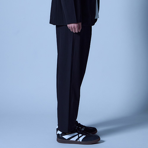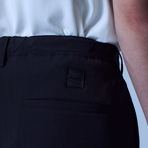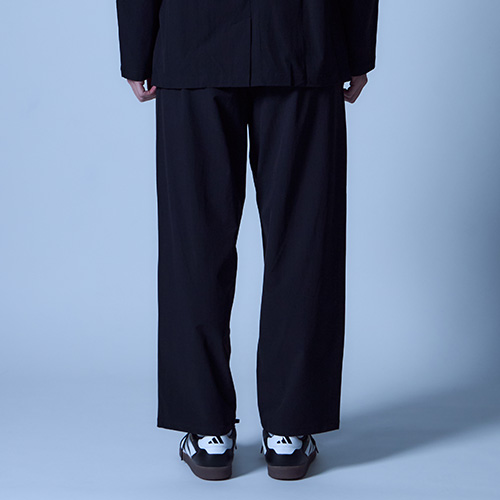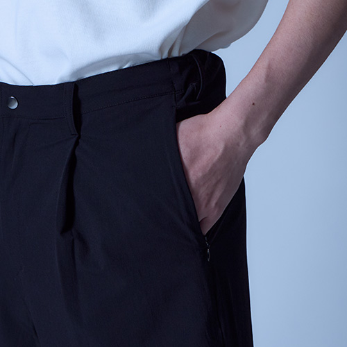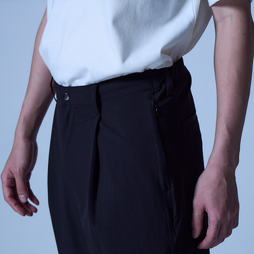 スポーツテイストを加えたロングパンツ。シワになりにくく、移動着や出張にも幅広く使えます。ジャケットよりも単品として着用しやすく、ON/OFF兼用のパンツです。ONではベルト、OFFではウエストの紐を使用したベルトレスがおススメです。