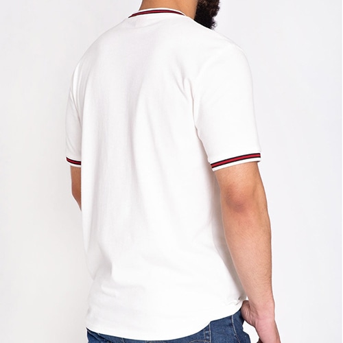 ・首元と袖口に黒と赤のストライプのディテール