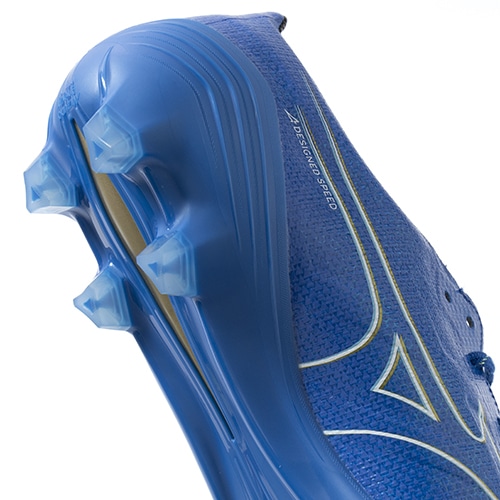 ●基本的なスタッド配置はMORELIAシリーズを参考にしつつ、より縦へのスピードやクイックな動きを実現するための「トライアングルスタッド」を採用。踵部分は高反発ソール素材(MIZUNO ENERZY)を使用することで、クッション性が向上し、ハードワークに貢献。