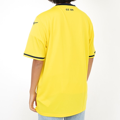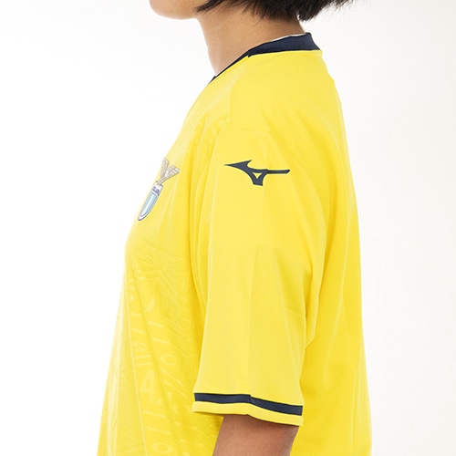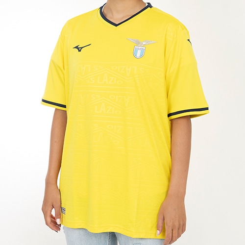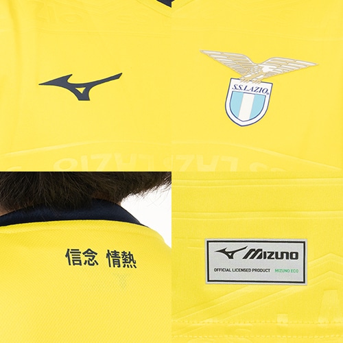 90年代にクラブが着用したいくつかの象徴的なシャツからインスピレーションを得て、現代風にアレンジしています。前面に繰り返される幾何学模様の中にSS Lazioの文字がトーン・オン・トーンのレリーフでプリントされています。シャツの背中には、テクニカルスポンサー、クラブ、ファンの間の絆と団結を繰り返し示すために、「一つの信念、一つの情熱」というモットーが日本語で書かれています。