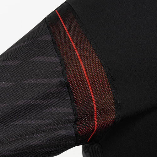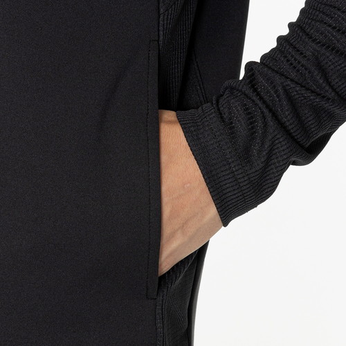 ボディには吸汗速乾性を備えた生地を採用。風合いも良く、着用時の仕立ての良さを感じられます。後身の肩部分にはメッシュパーツを配置し、プレー中の激しい動きにも配慮しました。袖には高通気素材を採用し、汗をかいた時の快適性に寄与しています。脇ポケット付き、ポケットファスナー無し。