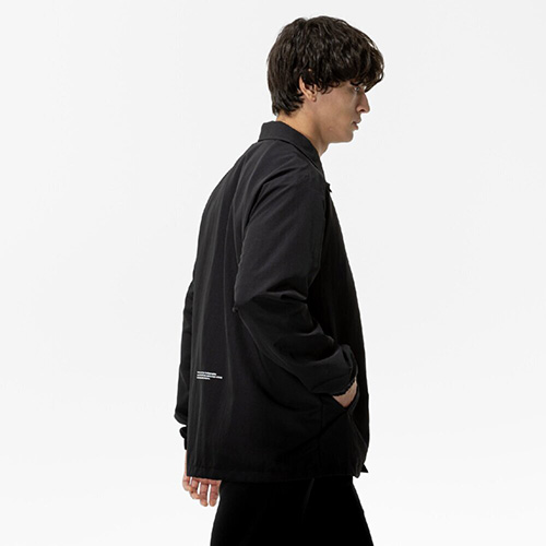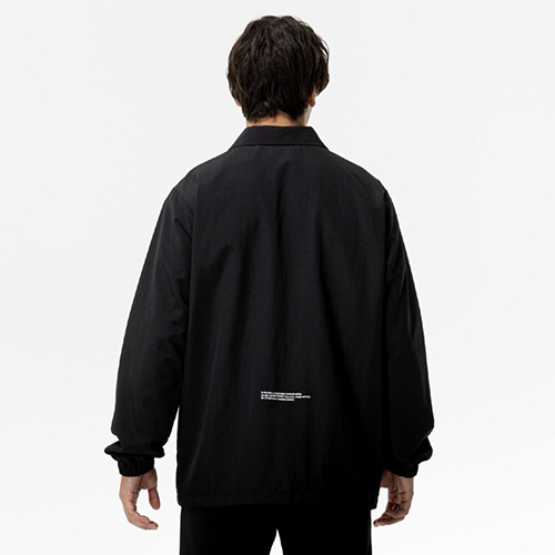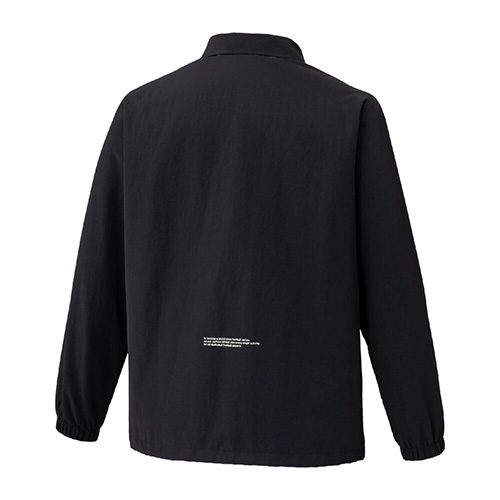 ブランドロゴと、ブランドメッセージのロゴのみをプリントしたシンプルなデザイン。撥水性を備えた表面感のある生地を採用、内側は総裏メッシュ仕様。裾にはロゴ入りのドローコードが付属し、裾回りの調整が可能。プレーンな状態でも着用できることを前提としながら、チームユースでも採用できるようマーキングスペースを確保。前後身頃に配置したロゴと合わせて、チームロゴやエンブレムをマーク加工することで、チームごとに独自の表現をする余白を残したアイテム。サイドポケットあり(ファスナーなし)