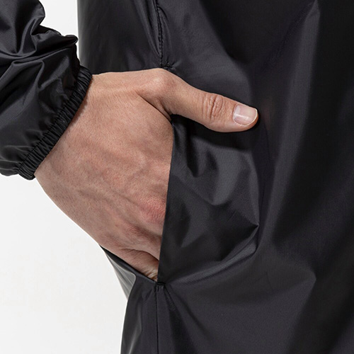 撥水加工を施したリップ布帛を採用。端境期の肌寒い時期や雨天の際に、手軽に羽織れる1着。ボディのロゴプリントはクリアにすることで、シックな雰囲気のデザインに仕上げながら、スプリットファスナーのゴールドをアクセントカラーにチョイス。裏地無し。サイドポケットあり。