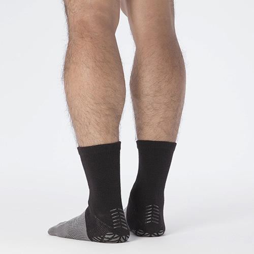 ●足とソックスの滑りを少しでも無くすべく肌面もグリップ。足全体(カカトからつま先まで)のソックス裏側に割線糸(ナノフロント)を使用。プリントではないので皮膚へのダメージも少なく、かつ滑りにくくするための設計。