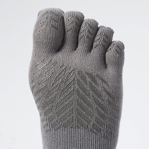 ●ソックスとシューズ(表側)の全包囲をグリップ。カカト裏、5本の指それぞれの裏、母指球で最も力が入るポイントに配置。足裏だけでなく、シューズとの一体感を向上させる為に足甲部分の大きな面積をカバー。さらに、シューズとのズレが感じやすいアキレス腱部分にもグリップ性向上のために配置。