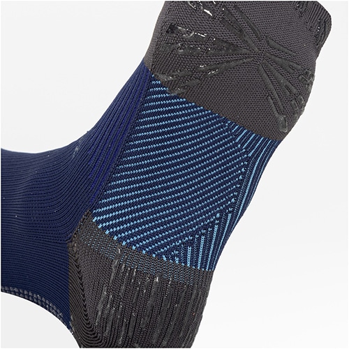 ●踵の後側から履き口まで加工されたシリコンプリントは、スパイクの踵とのグリップと、カーフソックスとの重ね履きを考慮。