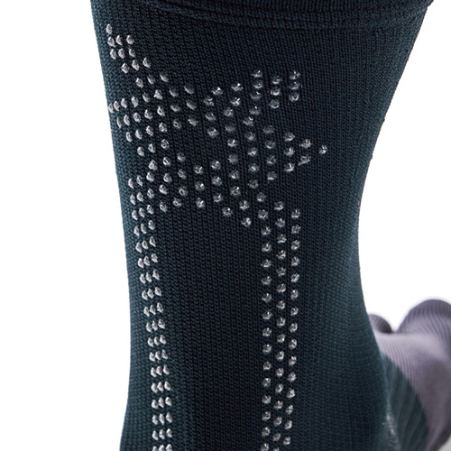 ●踵の後側から履き口まで加工されたシリコンプリントは、スパイクの踵とのグリップと、カーフソックスとの重ね履きを考慮。