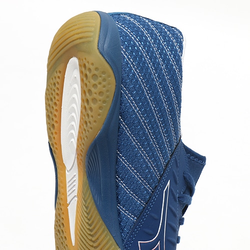 ●フルレングスミッドソール搭載。前足部内甲側、踵外甲側の大胆なラバー巻き上げ部分が、フットサルにおけるクイックモーションをサポート。