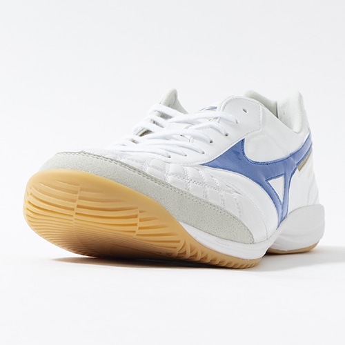 ●アッパー前足部には足馴染みの良い天然皮革を引き続き採用し、ミズノにしか出せないフィッティングを追求。また、フットサル専用クロスステッチが天然皮革の伸びを抑制。