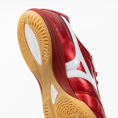 ●アッパー前足部には足馴染みの良い天然皮革を引き続き採用し、ミズノにしか出せないフィッティングを追求。また、フットサル専用クロスステッチが天然皮革の伸びを抑制。