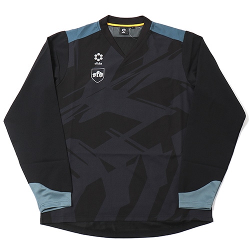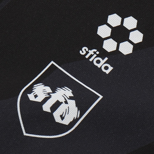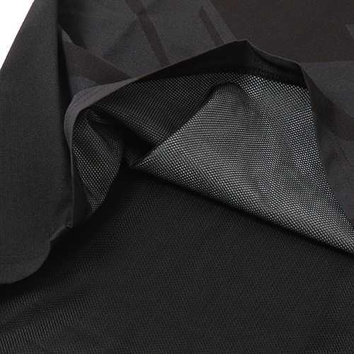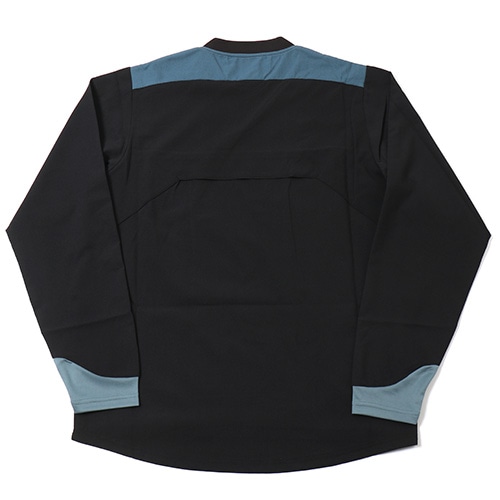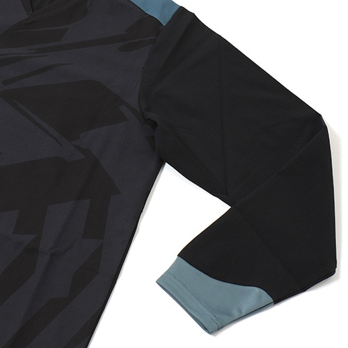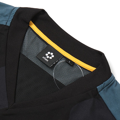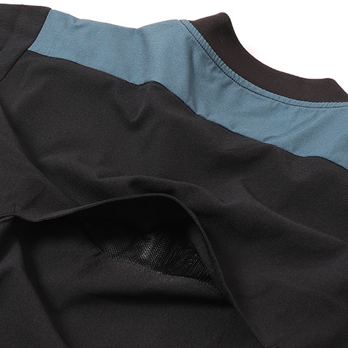 身頃裏は快適性を考慮したポリエステルメッシュライニング仕様。快適な着脱とすっきりとした襟元を両立するVネックリブ設計。背中のベンチレーション構造で適度な通気を促します。袖口のカッティングとニットファブリック構造は着用時の快適性とすっきりとしたシルエットを両立します。Echo of striker -縦横無尽に響き渡る、存在を焼き付けるその勝利の意志はゲームを制圧する連弾譜となります。