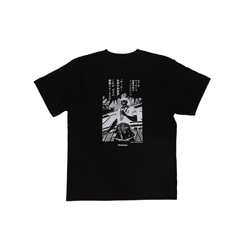 前面に 「FOOTBALL FOR WORLD PEACE」のメッセージを大胆にプリント。背面には『キャプテン翼』のワールドユース編から、優勝時のスピーチをする翼くんの名シーンをデザイン。サッカーを通じて友情や平和を感じられる ストーリーのある一枚です。