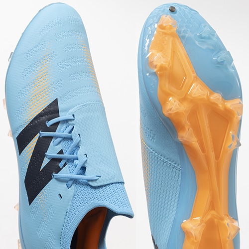 ●圧倒的な加速力を生み出すアウトソールを前モデルより継承。どんなグラウンドにおいても加速時・減速時に高いグリップ性を提供するトライアングルスタッドを全面に配置。 HGソール内部にはナイロンシャシーを搭載しソール合成、スタッドの貫通力を確保、プレー中の高い安定性、安全性を実現。