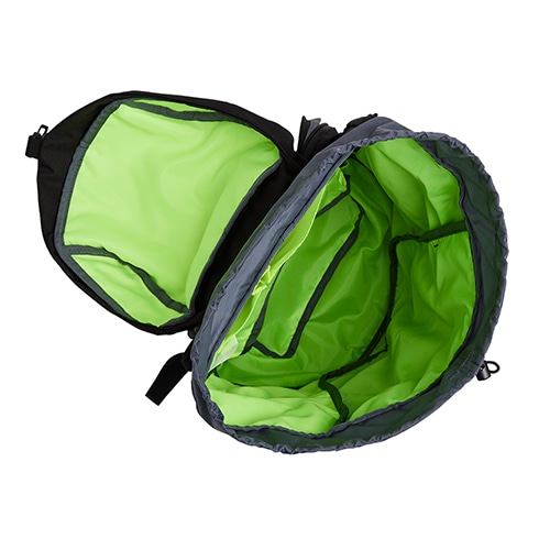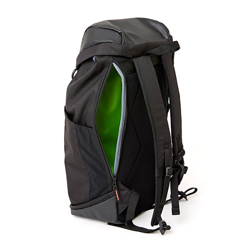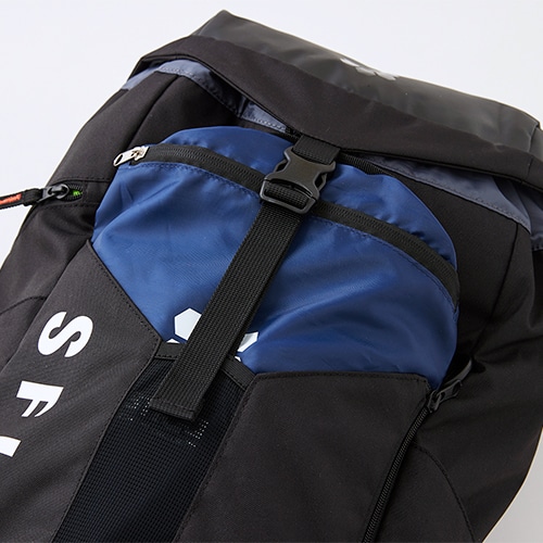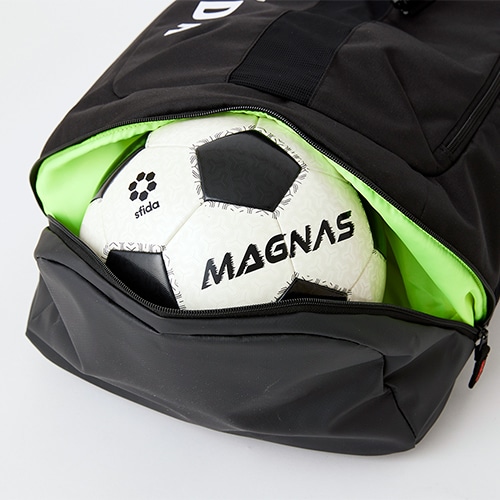 ●内装にクッション付きPCポケット。サイドアクセスファスナー付き。シューズ2足もしくは底面収納にはボールも入れる事が可能。