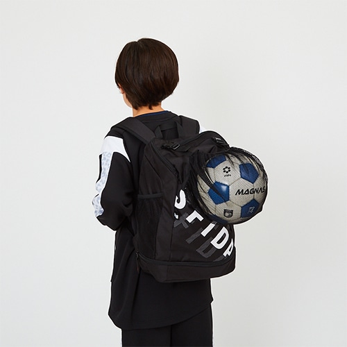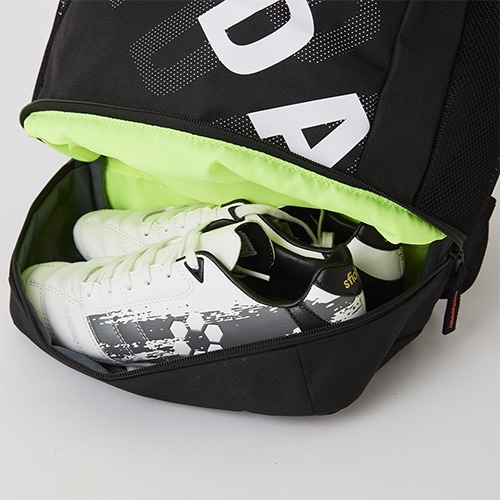 ●底面にシューズ収納可能。適宜使用可能なボール用収納バッグは、TOP面に安定性を高めた設計。背中のリフレクトテープで夜間歩行時の視認性を高め安全をサポート。