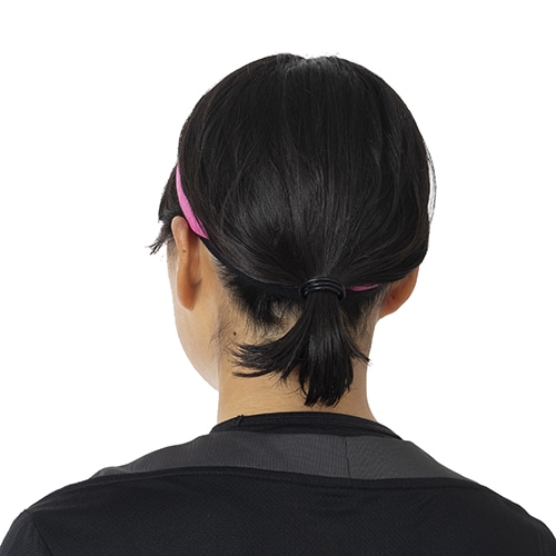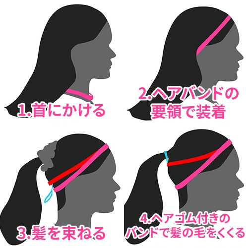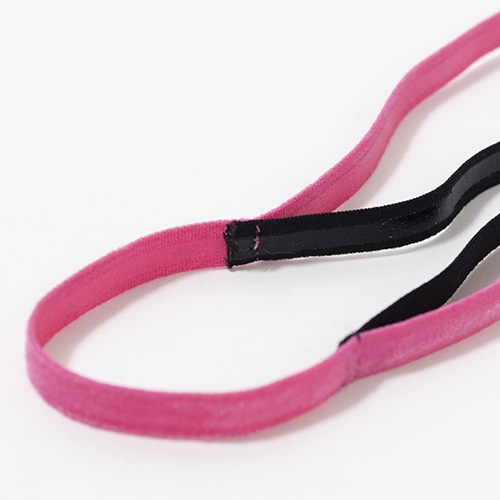 ●2本のヘアバンドとヘアゴムの一体型構造によって固定力がアップ。「ヘアバンドのずれ」や「ヘアゴムがほどけ」を解消します。