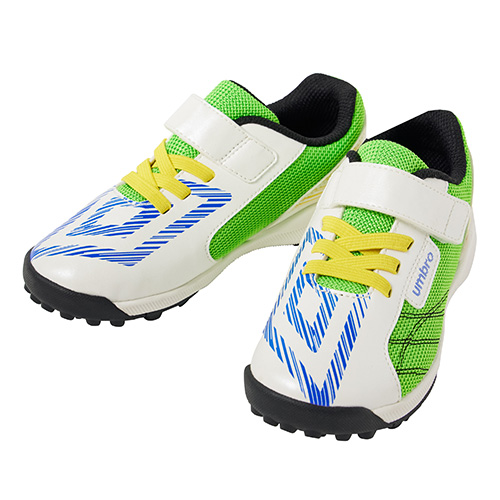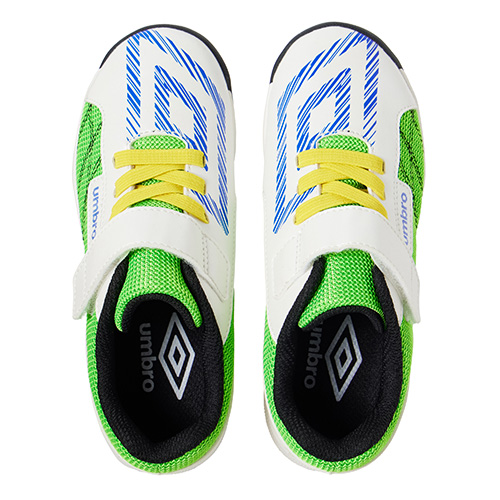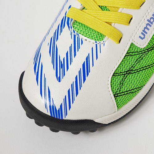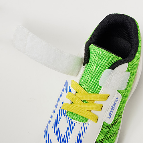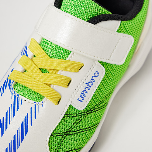 - サッカーシューズをはじめて履く時に足あたりを気にされることが多いという課題に対して、アッパーのアウトサイドをメッシュ素材にする改善提案を行ったジュニア用シューズ。性別を問わず履きやすいカラーリングを採用。