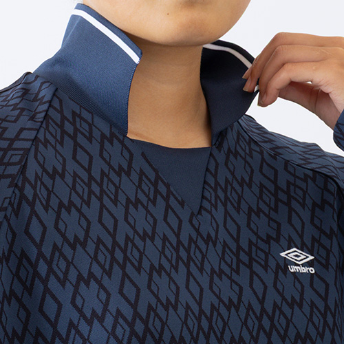シーズングラフィックを大胆にジャガード柄に落とし込んだ襟付きプラクティスシャツ。肩口のラインテープがデザインポイント。裏側の縫い代に消臭テープ『DEO SCREEN』を縫い付けることで快適な着心地を実現。