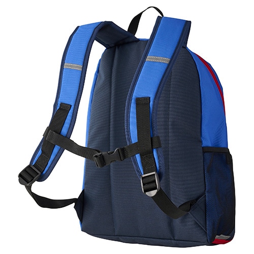 収納にはアイコンプリントが施されており、お子さまが何をどこに収納するのかが分かりやすい仕様。底部分にはシューズが収納可能で、本体横メッシュポケットにはシンガード、ボール用ネットも搭載しているので、外付けが可能。また本体内側中央には水筒用ポケットを配置している為、自転車に乗った際にも重心が崩れにくいようになっている。その他小物ポケット、本体前側には汚れ物も仕分けが可能。再帰反射材を前・ショルダーベルト・サイド部分に配置していることで自動車からの視認性もUP。背面内側に、ネームラベルを付けています。汚れが気になったら、ネットに入れて洗濯機で洗えます。