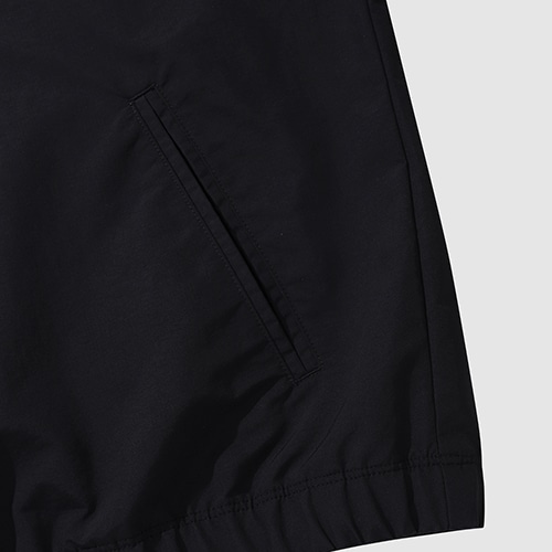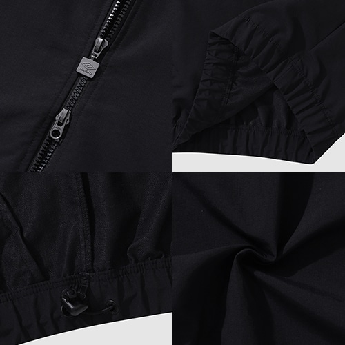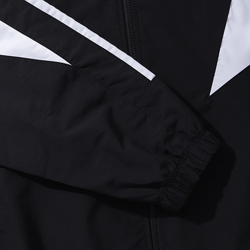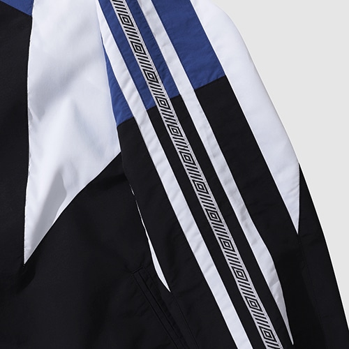 サイドテープとカラーブロック、背面のビッグロゴがデザインポイントのウインドジャケット。裾の紐でフィット感を調節。