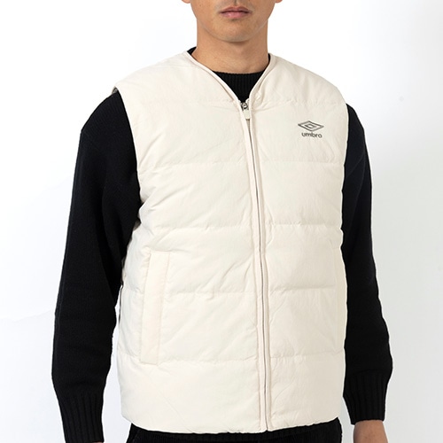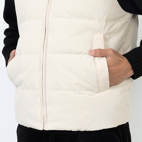 シンプルなデザインで幅広いシーンで着用可能な薄手のダウンベスト。