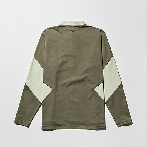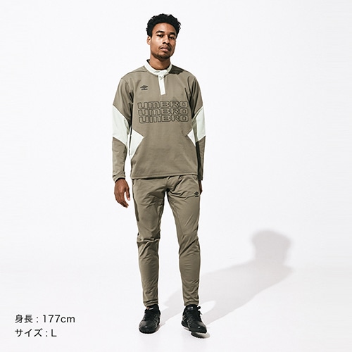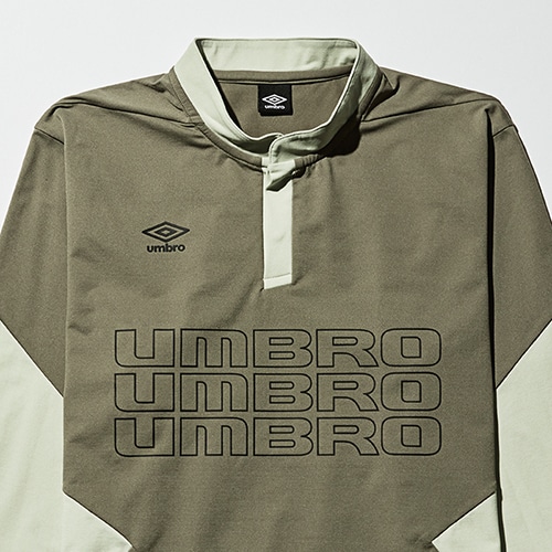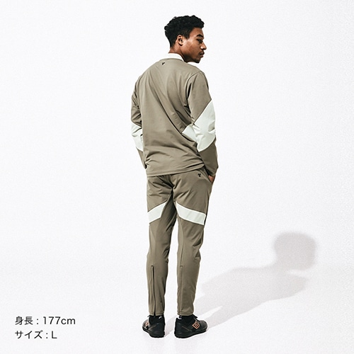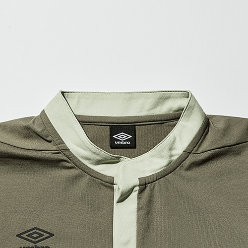 ハリコシが特徴の素材を採用した被りのジャージアイテム。着脱のしやすさを考慮し、襟元は立ち襟のボタン仕様に。フィールド上での着用はもちろんのこと、オフシーンでも着られるカーキやブラックカラーもバランスよく配色したアイテム。ジャージパンツ(UUUVJG13)とのセットアップでの着こなしがおススメ。