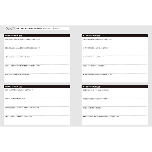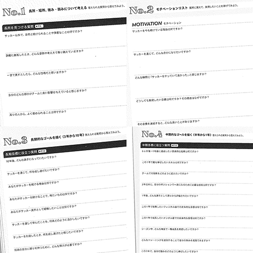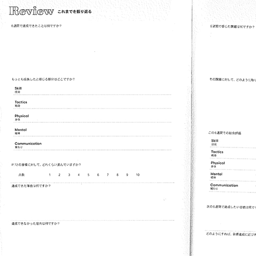 ノートに用意されている質問に答えていくだけで、自分の目標や思考を可視化できるため、日々の課題やテーマが明確になります。練習や試合の振り返りだけではなく、長所や短所・技術的な強みと弱みを整理する自己分析のページも用意。短期~長期の目標設定も行うことができるため、スキルやフィジカル・メンタルなどの各要素がバランスよく成長できる構成となっています。