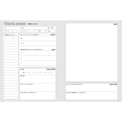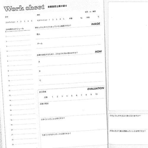 また、サッカー選手として管理すべき、体温や体重・スケジュールの記入欄もあり、自己管理能力を高めて、常に良いコンディションでトレーニングや試合に臨むことにも役立ちます。
