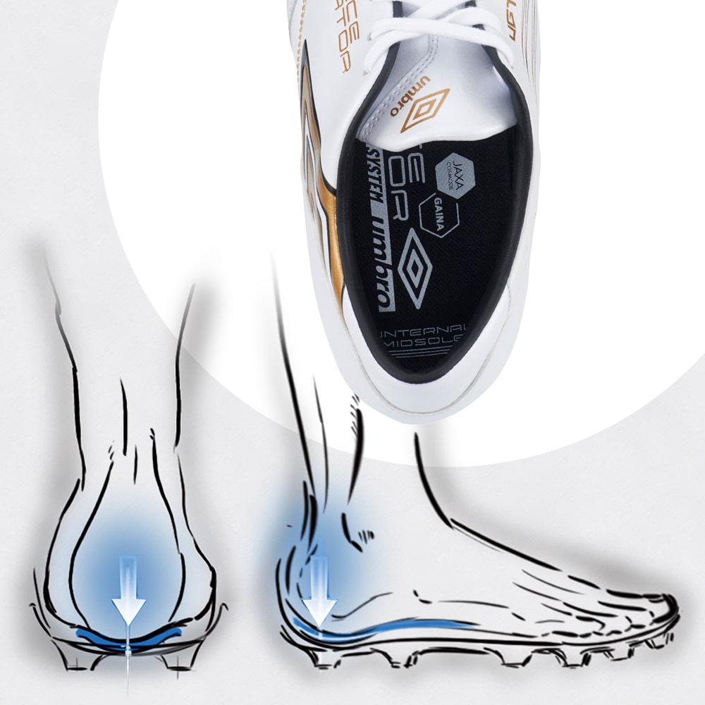 内蔵のクッショニング材により足底の衝撃緩衝に加え、