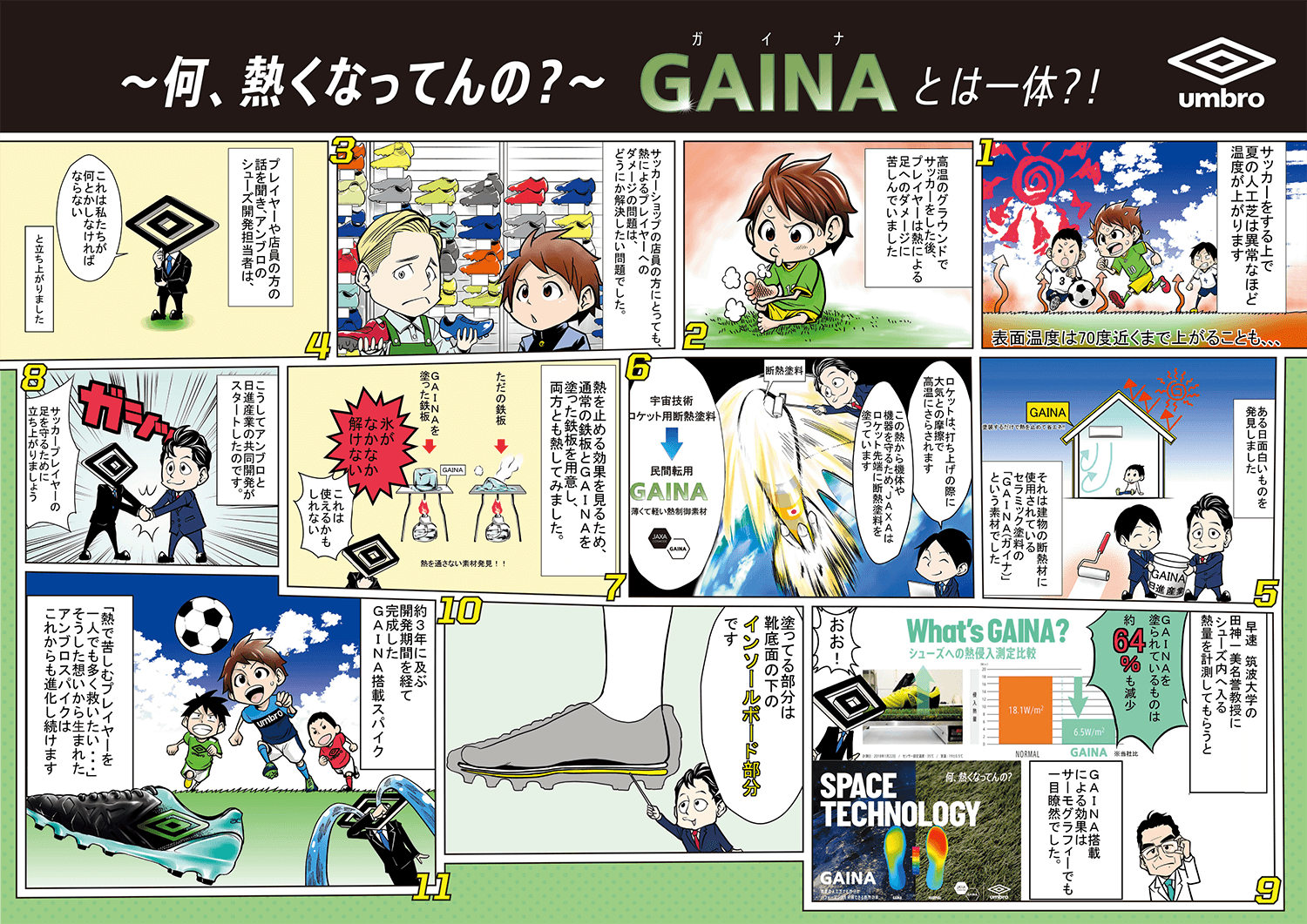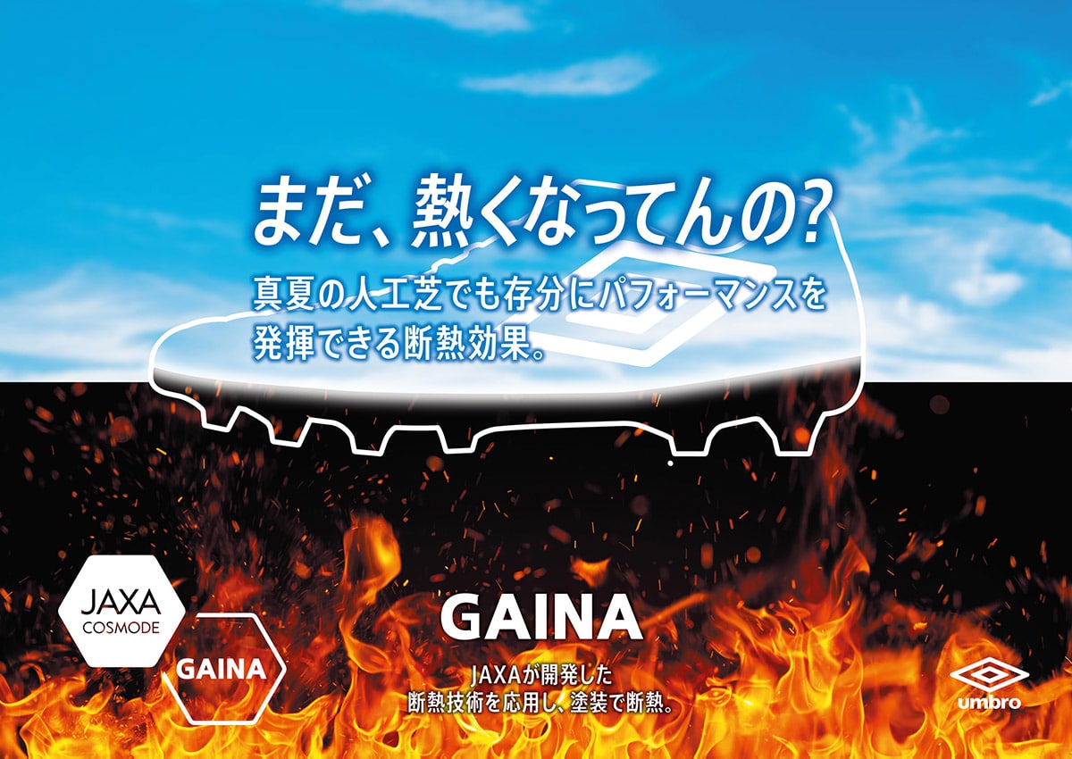 真夏の人工芝の熱からプレイヤーの足裏を守る「GAINA(ガイナ)」搭載スパイク&シューズ。