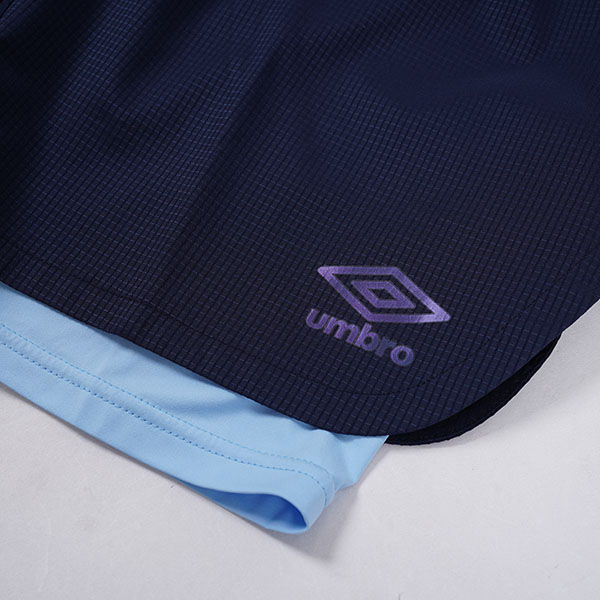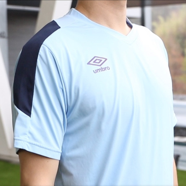 暑さや紫外線もガードするUV機能・吸水速乾あり。アンブロロゴは角度によりカラーが変わって見える綺麗なマジョーラプリント。
