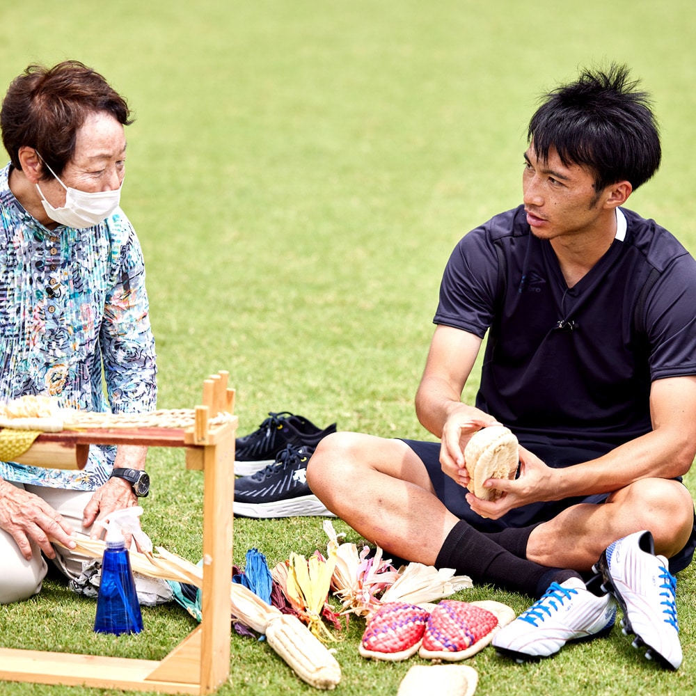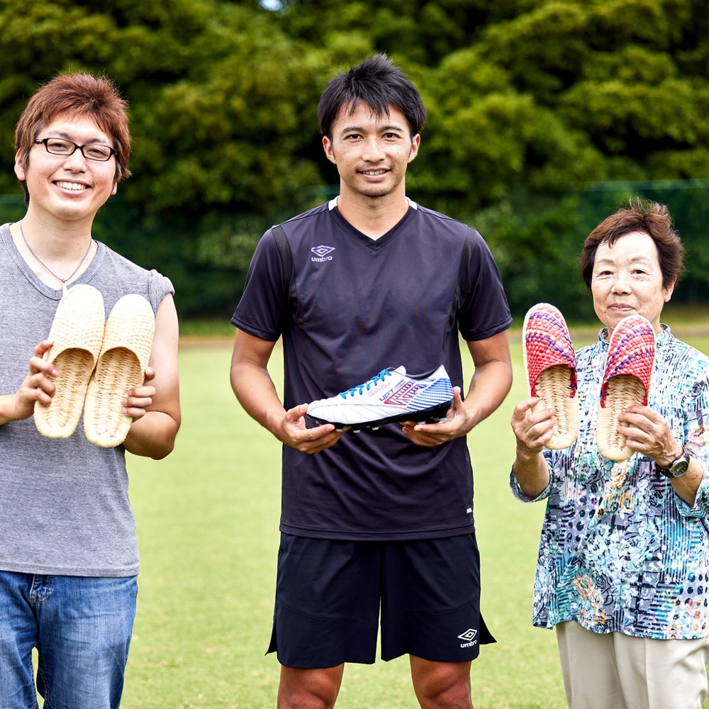 『ACCERATOR』シリーズの柴崎選手とのオリジナル企画 U by GAKU 2022年モデル。 今作ではていねいな手仕事で仕上げるきみがらスリッパの文化を表現しました。